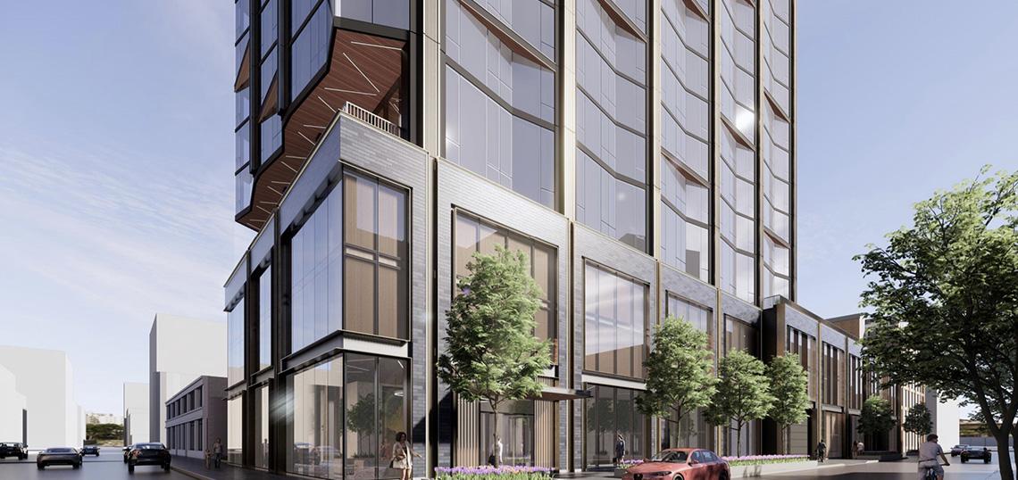 The design of the tower is expressed as a slender volume that is positioned at the northwest corner of the podium to maintain the street wall along the two street frontages. The facade is regulated by the expression of the structure vertically as the columns get pushed to the perimeter of the massing. The volume is faceted with a staggered pattern of folding planes that create a sawtooth profile that will reflect the sun at different angles throughout the day to enliven the facade. Horizontal breaks are added at a staggered rhythm of every four floors to modulate the scale of the facade and invoke solidity.
