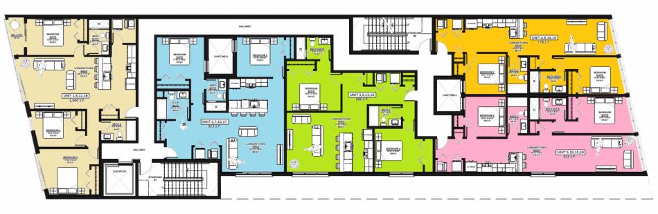 On the ground floor, the lobby will face N. Sheridan Rd, with 10 parking spaces and 20 bike parking spaces in the back portion of the ground floor. On the upper four floors, each level will have five units, with a total mix of 16 two-bedrooms and 4 three-bedroom units. The roof of the building will have a shared deck for residents to have access to outdoor green space.
