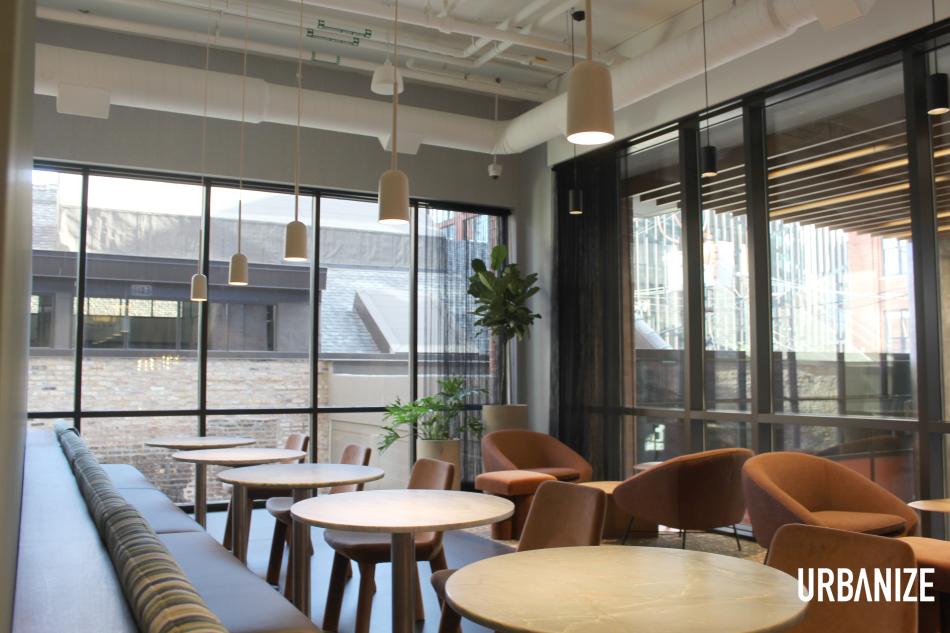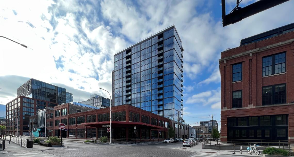 With architecture from NORR and interiors by LG Design, residents will enter along N. Aberdeen St through a covered entry that features old brick pavers, seating, and landscaping. The residential entry includes seating with elevators and the mailroom off to the side. The historic Arthur Harris building has been retained and is for lease as retail space. A further retail space at the corner of W. Lake St and N. Aberdeen St will combine with the Arthur Harris space for a total of approximately 10,700 square feet of retail space in the building.