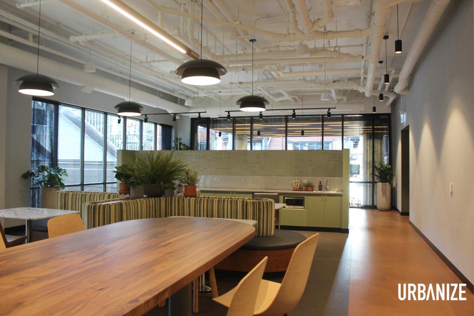 Heading up to the second floor, we next walked through the amenity spaces that include a resident lounge overlooking the residential entry and Arthur Harris building to the north, a large fitness center with HIIT space, and coworking space tucked back into the floor plate offering meeting rooms and conference space. A portion of the first and second floors will provide 98 car parking spaces and 288 bike parking spaces for residents.