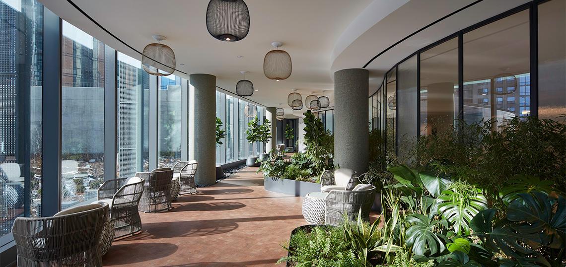 Developer Lendlease, along with partner Magellan Development Group, is ahead of the curve with this biophilic amenity that provides residents of the 503-unit Lakeshore East apartment tower Cascade, and the adjacent Cirrus condominiums, with a nature-filled escape overlooking the development’s publicly accessible Cascade Park. Residents can find respite among an abundance of plant life – think fiddle-leaf figs, shrubs and ferns – even on the coldest winter days.