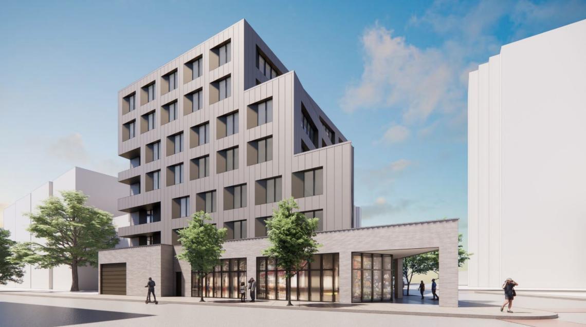 Rising 80 feet tall, the new seven-story building will hold 66 residential units, split into 32 studios, 32 one-beds, and 2 two-beds. 20% of the units will be affordable at an average of 60% AMI to meet ARO requirements.