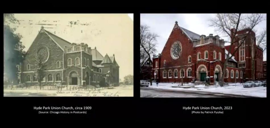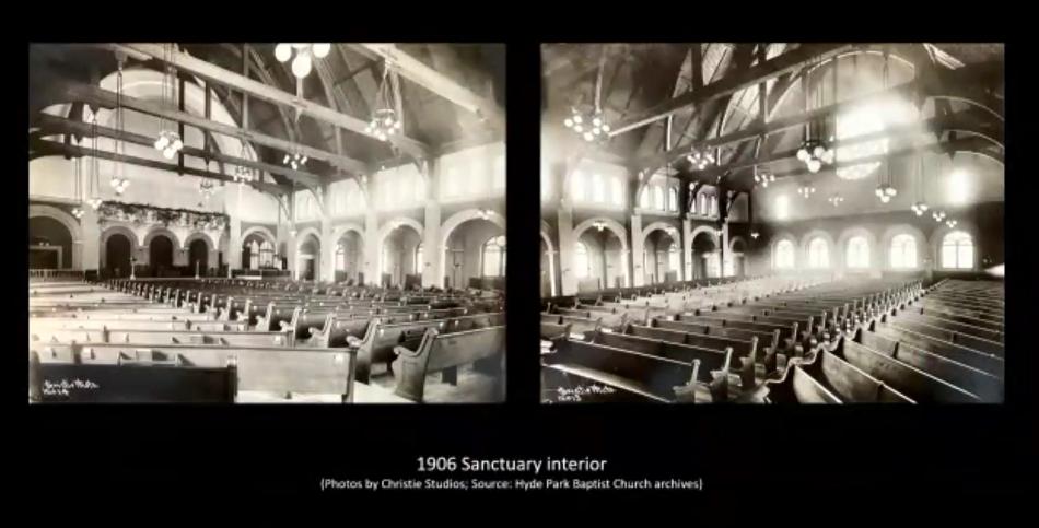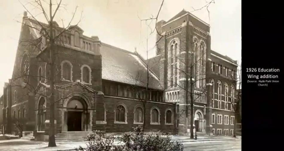 Meeting Criterion 1 for its heritage, the history of Hyde Park Union Church goes as far back as 1874 when the First Baptist Church of Hyde Park Congregation’s first home was a wood-framed structure at the corner of 54th and Dorchester. The original church building was demolished in preparation for the construction of a new church, and two lots to the west were purchased to construct the larger two-story Richardsonian Romanesque-style church.