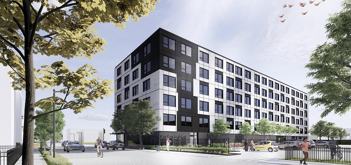 The design aims to deliver a modern aesthetic with a facade pattern that breaks up the length of the structure. The ground floor will hold the residential lobby at the corner of W. Roosevelt Rd and S. Throop St. Amenities will include a fitness center, a dog run, and outdoor amenity space.