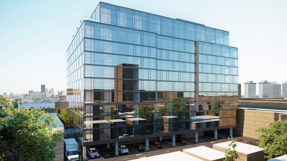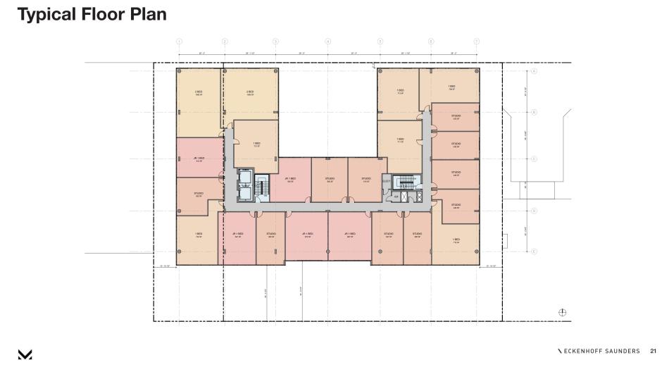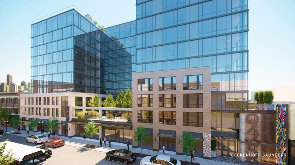Designed by Eckenhoff Saunders, the proposal would consist of an 11-story mixed-use development. The building’s massing began with maximizing the site’s footprint, then establishing setbacks on the sides and creating a central courtyard in the middle. The carved-out massing was then reallocated vertically, making the building taller. The facade will be a combination of smaller brick facades with the rest of the massing rising with a glass and metal window wall system.