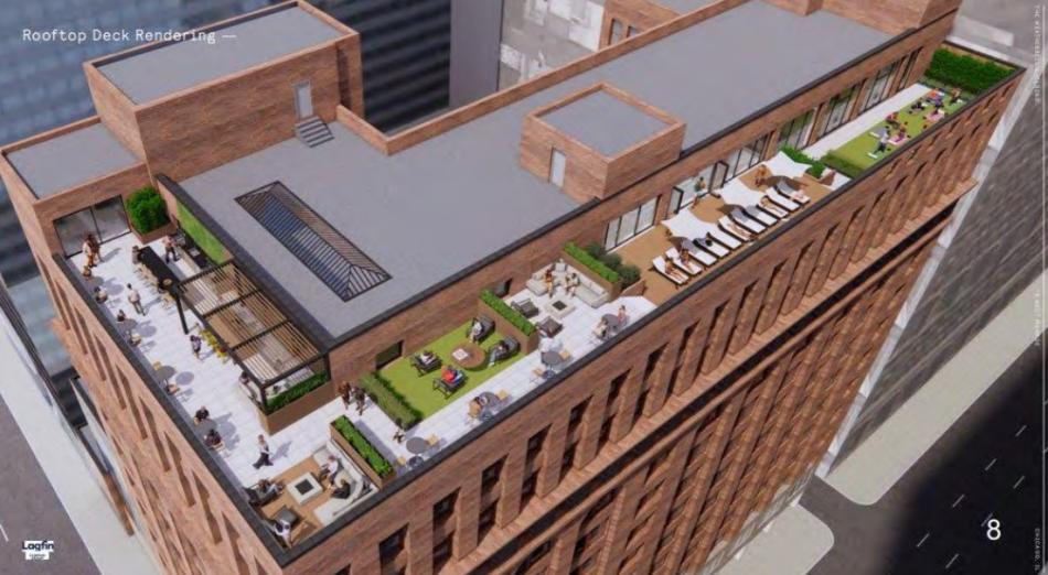 Preservation efforts will focus on retaining and repairing the building’s character-defining exterior masonry, including brick, stone, and terra-cotta elements. The non-historic windows on the second through seventh floors will be retained, while the historic wood windows on floors 8 through 13 will be repaired. Metal fire windows on secondary elevations will be replaced with new aluminum windows designed to match the existing profiles. Internally, the existing elevator lobbies and corridors on floors 7 through 13 will be preserved, with nearby office spaces reconfigured into apartment units.