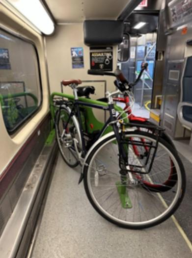 Under the new policy, bicycles and scooters, including e-bikes and e-scooters, are permitted on all trains, either in the priority seating areas of ADA-accessible railcars or in the new racks on railcars with the bike logo. There is no charge. Bicycle and scooter spaces are allocated on a first-come, first-served basis, and customers with disabilities have priority in the priority seating areas on ADA-accessible railcars.