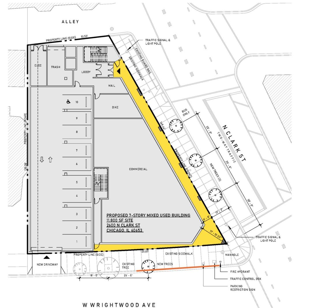 Rising 80 feet tall, the new seven-story building would hold 66 residential units, split into 32 studios, 32 one-beds, and 2 two-beds. 20% of the units will be affordable at an average of 60% AMI to meet ARO requirements. On the ground floor, commercial space will front N. Clark St and W. Wrightwood Ave with the residential lobby at the north end of the building. Residents will have access to a bike room with 75 bike spaces and a ground floor parking garage accessed from W. Wrightwood Ave with 10 parking spaces.