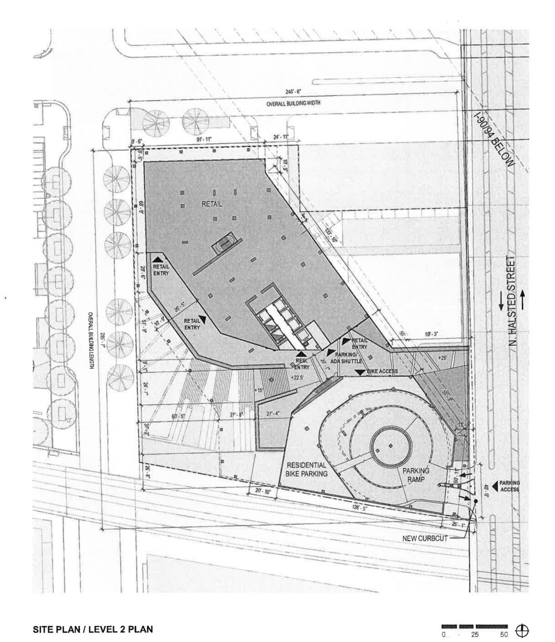 Rising 640 feet tall, the design retains the landscaped transition from N. Green St up to N. Halsted St through the site surrounded by retail space. A parking ramp in the southwest corner of the site will be accessible from W. Kinzie St and N. Halsted St, connecting up to the parking garage similarly to the original proposal. The residential tower will rise from the parking podium with a sculpted form that widens as it goes up with balconies integrated into the metal and glass facade.