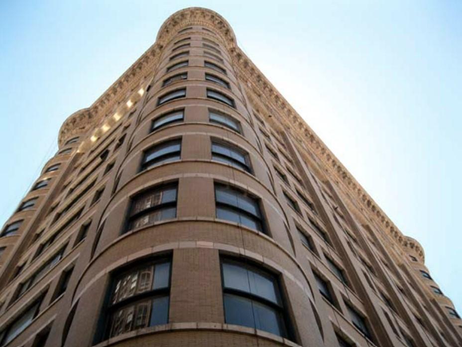 Characterized by circular turret-like corners and large curving windows, the Old Colony Building was the first tall building to use interior arches for structural bracing. Continuous vertical piers divide the building's long Dearborn Street facade into tall, narrow sections, while continuous horizontal spandrels serve to visually widen the narrow Van Buren Street facade. After years in disrepair, the building was restored and converted into student housing in 2015.