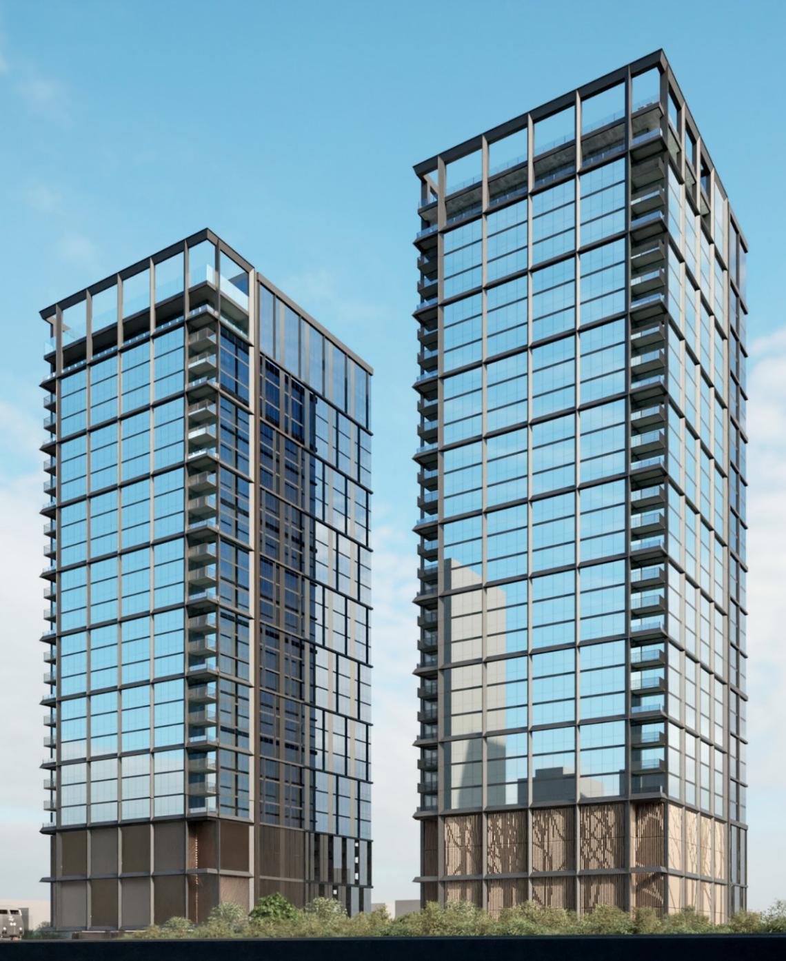 Rather than a large podium, the development has been designed as two rectangular point towers, with the eastern tower rising 33 floors at 374 feet tall and the western tower reaching 30 floors and 342 feet in height. The towers will have gridded facades made up of metal paneling and glazing. The parking floors will have a hybrid of architectural mesh and open-air glazing.