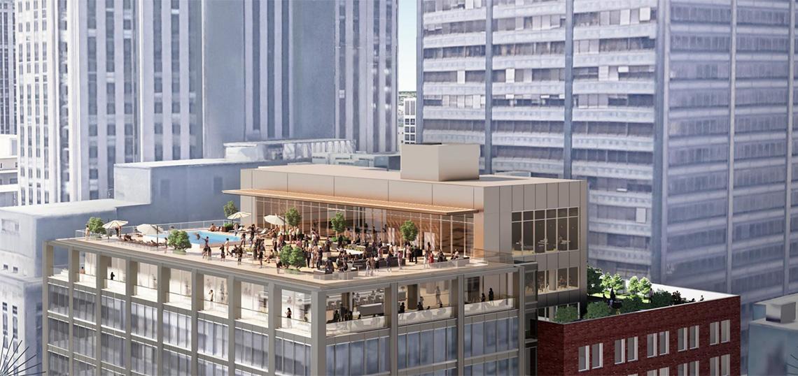 With Stantec on board for the design, the building will be converted into a mixed-use building, set to include 345 apartments, 226 hotel keys, and meeting/event space on the second floor. The roof level will be reactivated by reopening the original Monroe Club as an amenity for residents and hotel guests. The former mechanical penthouse will become a restaurant, with the outdoor deck including a pool.