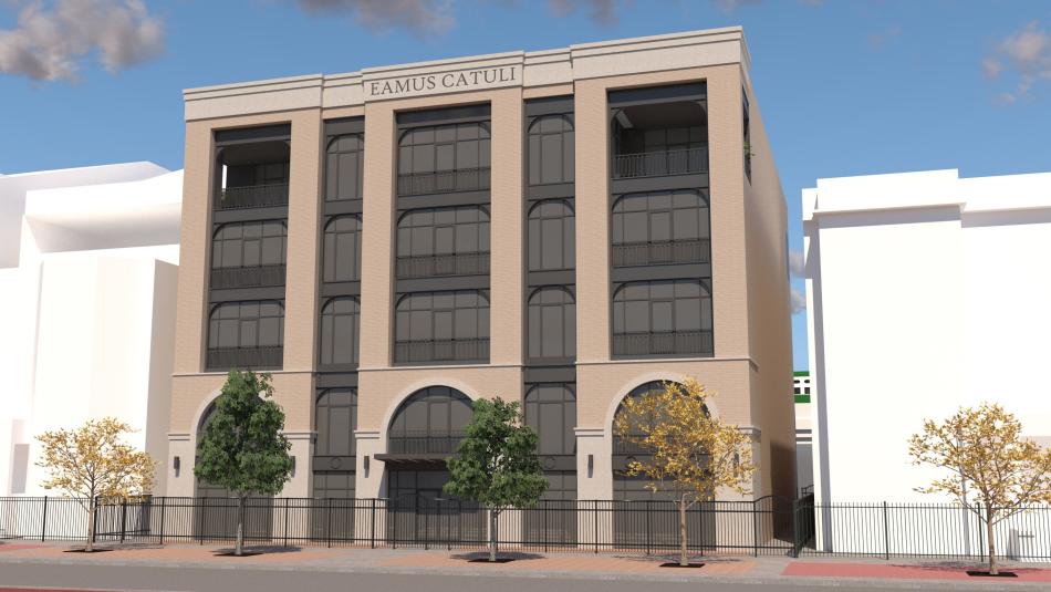 Designed by DXU Architects, the five-story building would top out at 69 feet tall. The building’s facade would consist of brick with stone copings and decorative metal panels and arches.