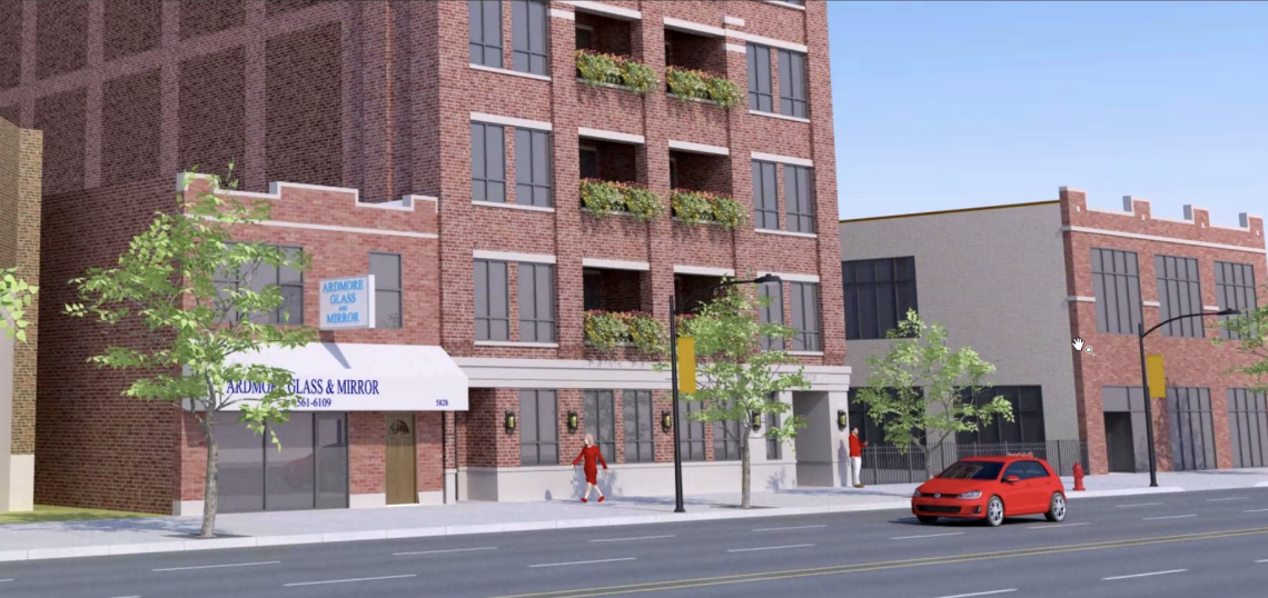 Designed by SGW Architecture & Design, the proposal sports a brick facade on all sides, exterior planters facing Broadway, and stone accents inspired by traditional Chicago buildings. Since the city's building code does not allow windows at the lot line (for fire safety reasons), the sides of 5828 N. Broadway will use two different colors of brick to create a grid pattern that mimics windows, according to its architects.